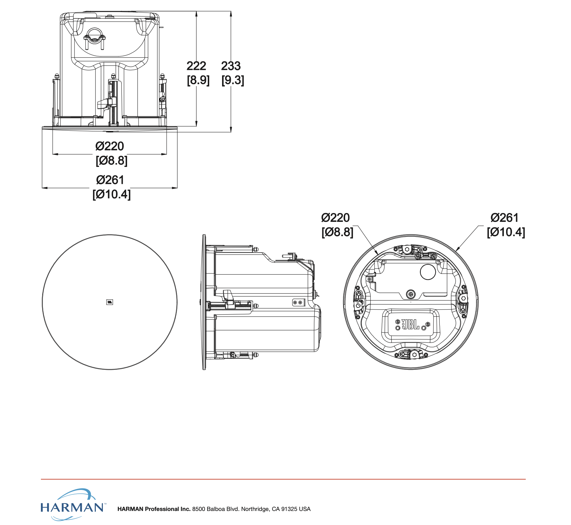 Głębokość od dolnej krawędzi sufitu do górnej części obudowy: 222 mm (8,9”)