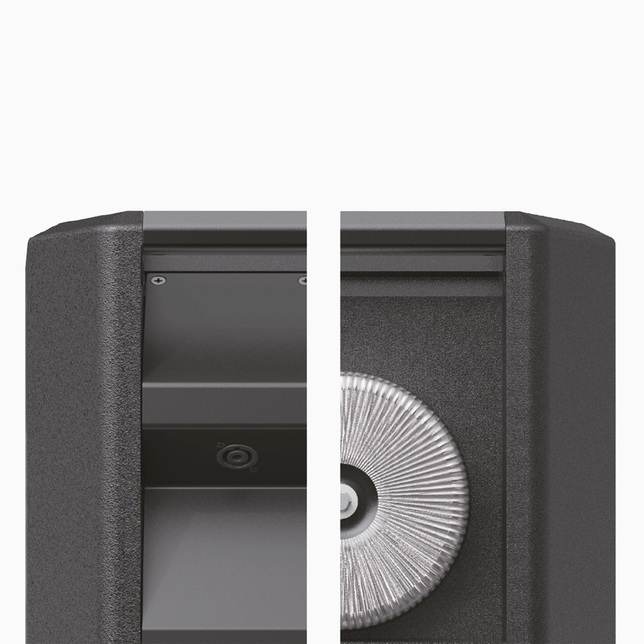 Dwa kątowe złącza głośnikowe Speakon zapewniają pewne i niezawodne połączenie oraz umożliwiają łatwe linkowanie kolejnych kolumn. Prowadzenie przewodów pod kątem minimalizuje ryzyko przerw w sygnale lub przypadkowych rozłączeń.