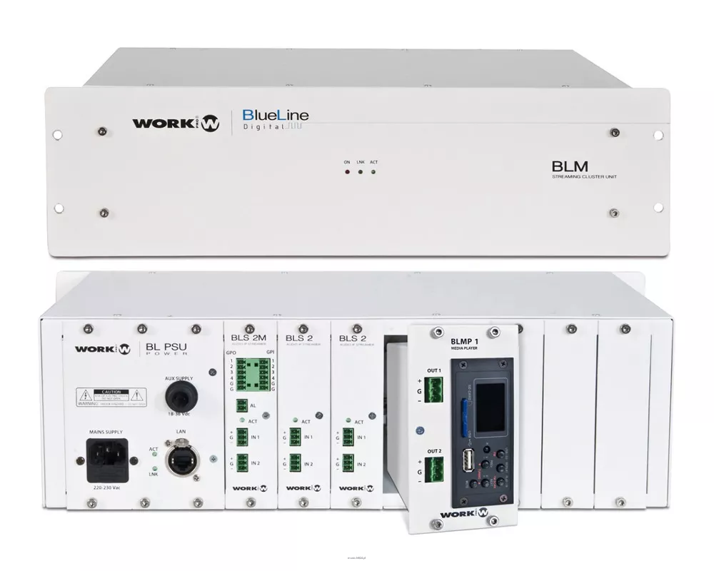 Modułowa jednostka centralna systemu BlueLine Digital, w obudowie o wysokości 3U do montażu w 19-calowych szafkach, złożona z głównej jednostki zasilającej (BL PSU) oraz dwukanałowego streamera ethernetowego (BLS 2M) z 8 złączami GPIO oraz komutatorem - do komunikacji z systemem alarmowym.